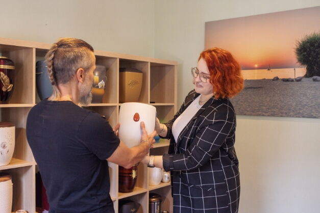 • Beratung zur Auswahl von Sarg, Urne, Wäsche und Zubehör – hauseigene Ausstellung